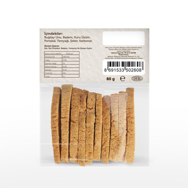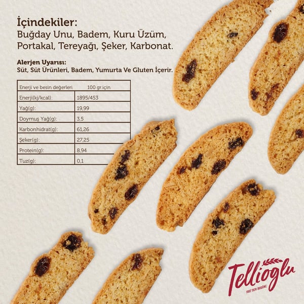 İçindekiler;Buğday Unu, Badem, Kuru Üzüm, Şeker, Tereyağı, arbonat, Portakal.